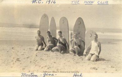 There are 5 men in bathing suits kneeling in a row on the beach at Willow Camp. Each has his surf board standing up in the sand behind him. Each surf board has a half moon decoration at its top. They are known as the Moon Club.