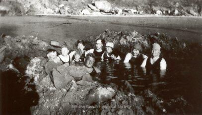 It is a photo of ten people (eight adults and two children) in bathing costumes, sitting in a tub constructed of dug out sand. The water (of the sulpher hot springs) is up to the adults' mid chests. There is flat sand behind them and rocks at the base of the cliff behind that.Collection