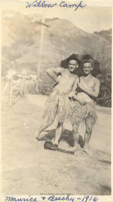 There are 2 men, Maurice and Beechy, wearing grass skirts posing with an umbrella over their shoulders and a ukelele at their feet. There is an open gate behind them leading to houses and the mountain in the background.Collection
