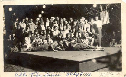 A black and white original photograph upwards of 40 men and women posing at the back of a platform (used as a dance platform?). There are strings of lights overhead and an American flag hanging at the right. In the lower margin is written 'After the Dance July 4. 1916. Willow Camp'.Collection