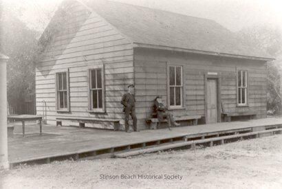 A frame building with a pitched roof, photographed from its corner showing two side windows, two front windows and a door. Along the front and side are long benches, at the time occupied by one older appearing man sitting in front, and by the side a standing man. Both appear to be wearing visored caps and possibly uniform jackets, not unlike railroad employees. The building rests on a wooden platform that extends in the picture to a small sliver of another structure on the left. A large bare table is in the left of the photograph and in the rear, trees frame the buildings. In the foreground a width of dirt road edges up to the wooden platform with irregular wooden steps to reach it.Collection