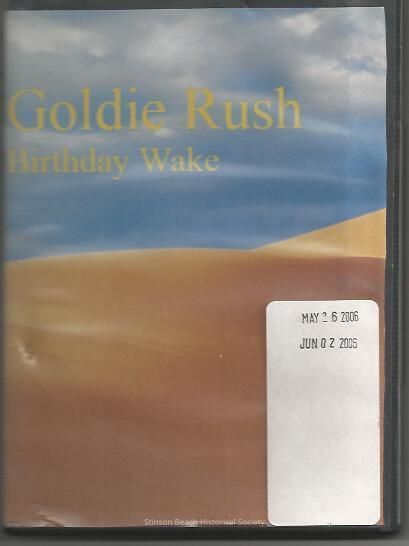 This is a movie on DVD made on the day of Goldie's wake in celebration of her life. She was a prominent member of The Grateful Dead family. Born in Marin, she made her home in Stinson Beach for many years. The movie include photos of her and her son, Ali, and her brother. The celebration began with a New Orleans style funeral procession. A 5-piece brass band led a procession through the town starting in front of the Parkside ending at the Community Center. Over 150 people and friends joined the procession. Wavy Gravy gave an opening eulogy and many people offered remembrances. At the community center, Dead member David Gans sang with Eric and Susie Thompson. Toward the end of the day an effigy of Goldie was burned on the beach with a rendition of "Happy Birthday." She died on Feb. 5th but this day April 14th was her birthday. The title on the tape is: Goldie Rush, Fare Thee Well.Collection