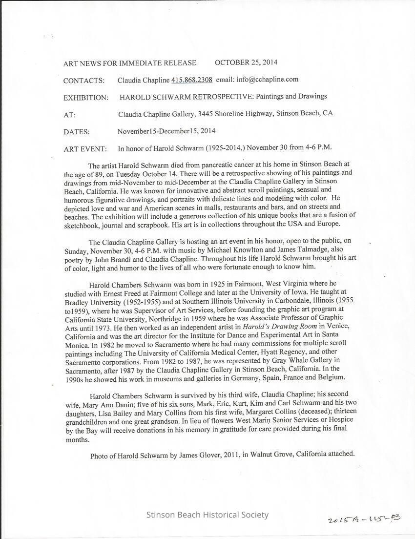 Press release written by Claudia Chapline who was married to Harold Schwarm who passed away on 10/14/2014. The press release was made on the occasion of his retrospective show to commemorate his long artistic career. It tells of his death, his art and his resume of works from his childhood. See the published obit, 2015A-115-04.Collection