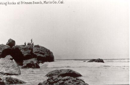 There are several large rocks on the beach, the smaller ones partiallly submerged by the incoming surf. There are 5 or 6 people on top of the largest rock at the left of the picture. They could be fishing off the rock but they are too small to be identified. The view is from the beach looking out toward the ocean.Collection