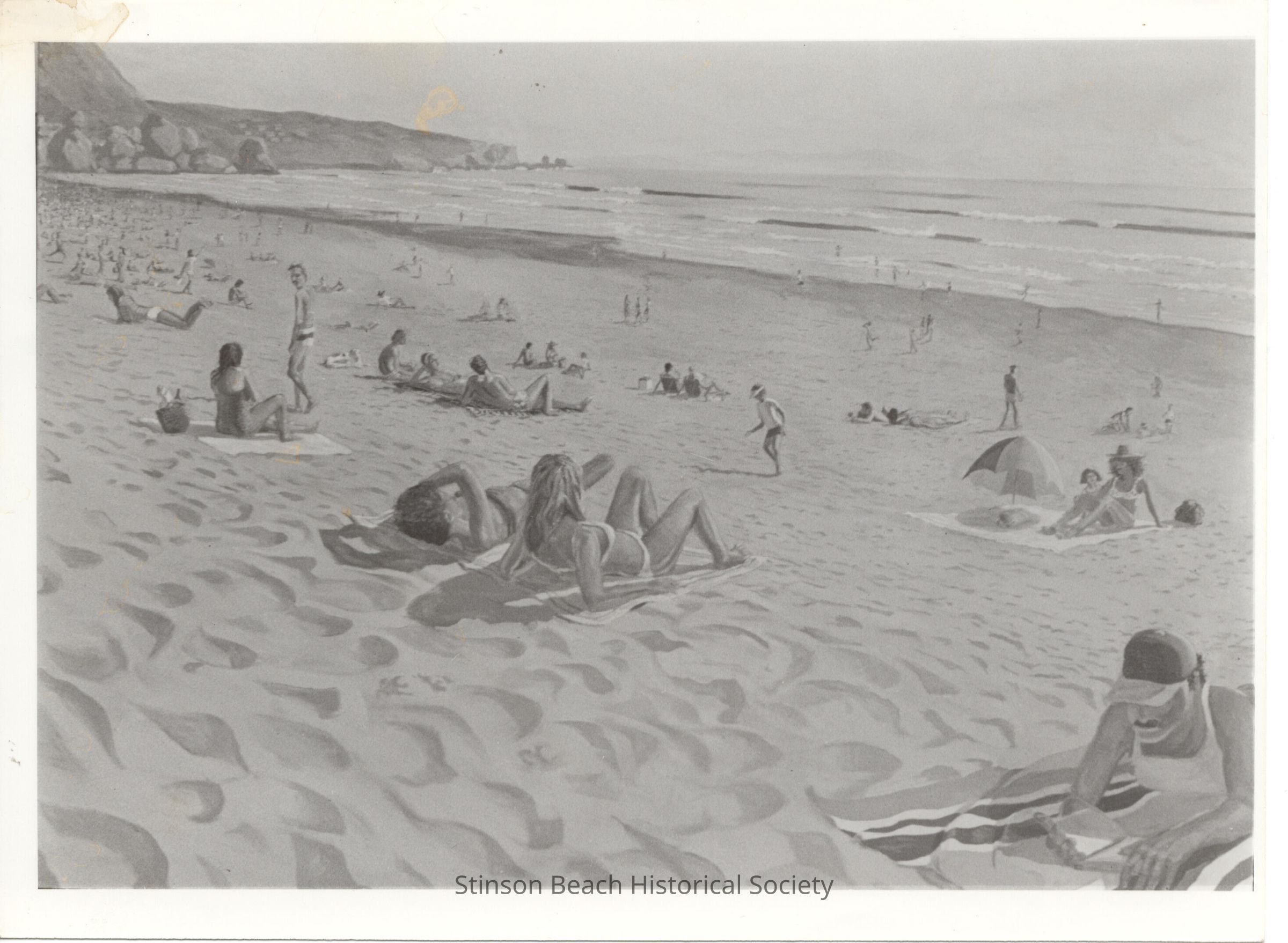 This is a photo of a painting by Michael Knowlton. There is a large sandy beach facing the ocean with several rocks on the shoreline in the background to the left. On the beach are several groups of people in bathing suits stretched out on beach towels in the sand.Collection