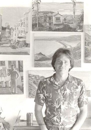 A black and white photo of Michael Knowlton, an artist living in Stinson Beach. He is wearing an aloha shirt standing in front of a display of his paintings.Collection