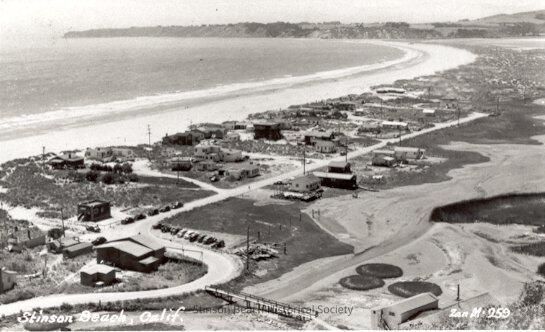 A very early black and white photograph-postcard of the stretch of beach on Bolinas Bay and a road (present Calle del Arroyo) running behind it with shorter roads branching off of it towards the water. Except for the first branch road on the left they are the roads to the patios with houses lining them. Joyce Moran 's house is the last one barely visible. At the bottom middle of the picture is a foot bridge crossing Easkoot Creek. The Bolinas headlands are at the top of the picture. There are three circular clumps of vegetation at the bottom right of the photo. On the bottom it is titled as "Stinson Beach, Calif" in white with ID#, Zan M. 259.see also 1993-864Collection