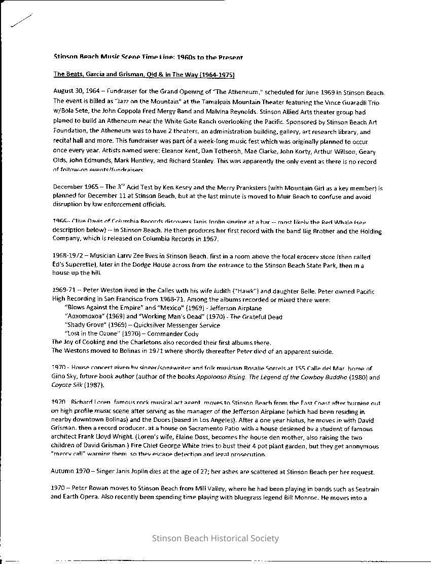 Stinson Beach Music Timeline:1960s to PresentEntry/Object ID