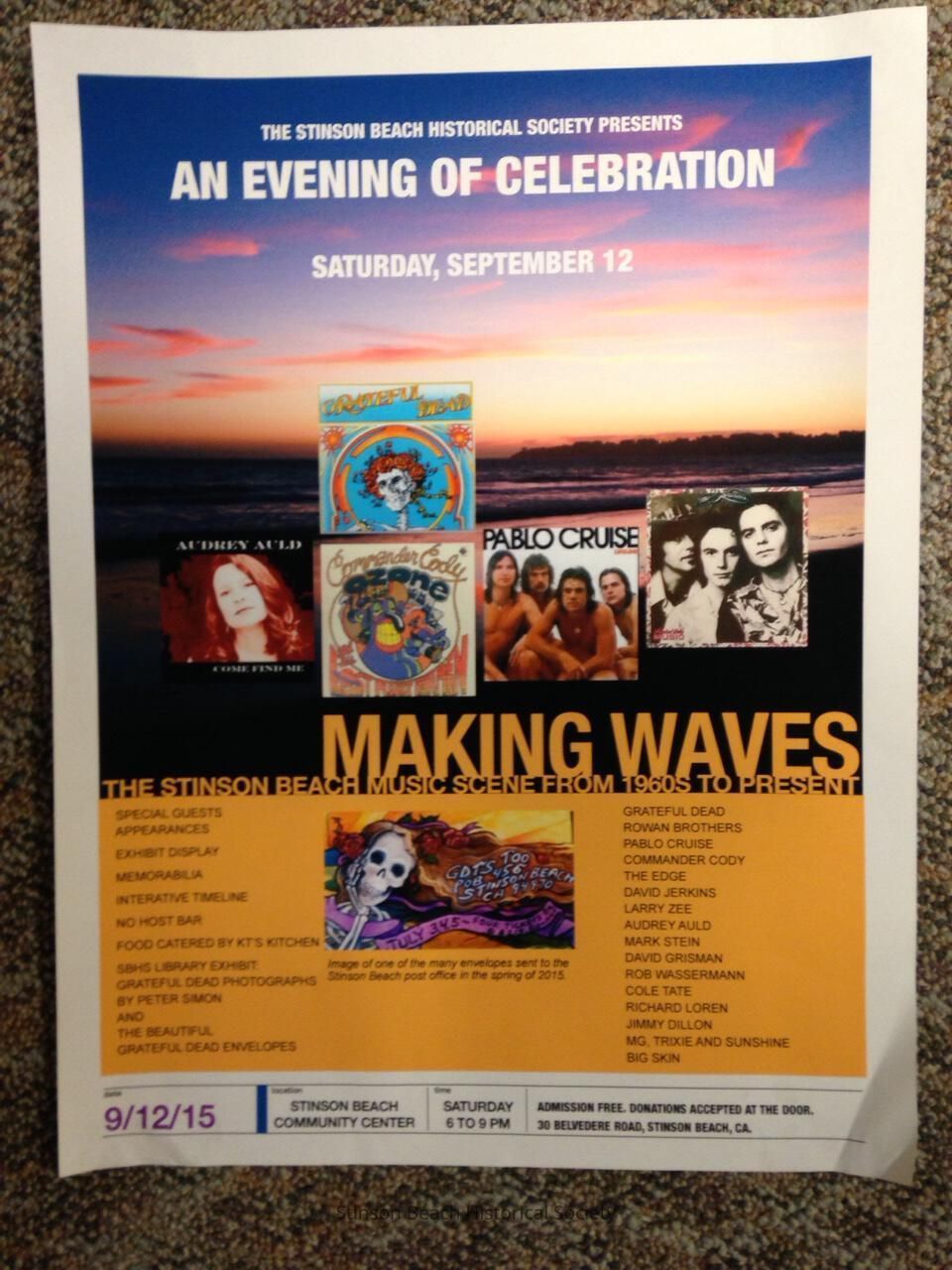 A poster created by Susan Banta for the occasion of SBHS Fundraising event of 9/12/2015 and related exhibits shown to coincide with the event. The event was titled, "Making Waves, the Stinson Beach Music Scene from 1960s to Present" and involved memorabilia shows, food and drinks, slide-shows and stage show by Local Musicians and talk of remembrances. See 2016A-100-04-02, 03, 04.