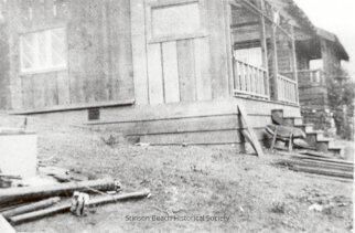 "Summer Cottage" built in summer of 1914 by Maybelle Louise Kelley at 50 Buena Vista, at the corner of Laurel Ave, Stinson Beach. The black and white photograph shows the side and front porch and stairs of a recently built house. There is lumber in the left foreground and at the right of the picture beside the steps. The house appears to be essentially finished with glass in the visible windows and the porch railing up. Copy of original.Collection