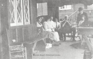A black and white photograph five women and two men gathered on the porch of the Kelley house. Four of the women, one of whom is wearing a hat, are seated against the house. To the right of them is a man seated and next to him is a woman seated with a man wearing a hat standing behind her. In the background behind the seated man is the neighboring house, known as 'The Anchorage'.Collection