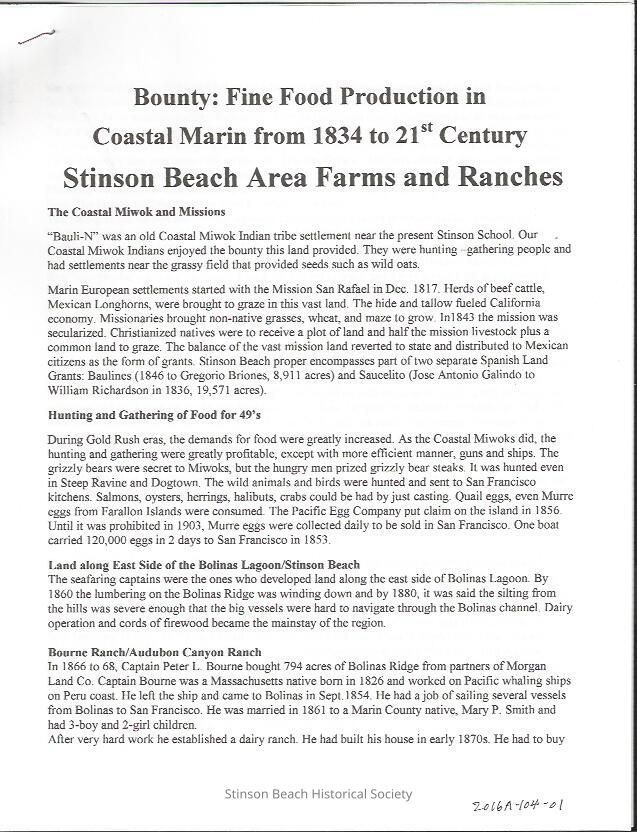 This is a hard copy of a history of local coastal farms and ranches established on the Eastside hills along the Bolinas Lagoon, to Slide Ranch to the south of Stinson Beach that presently share the same postal zip code, 94970. This writing was shortened from on-going survey of the same subject (2016A-104-02) by Tamae Agnoli in order to fit in the exhibit space of the Historical Corner of Stinson Beach Library. This survey was prepared as a part of joint exhibit with Bolinas Museum and Stinson Beach Library titled "Bounty: Fine Food Production in Coastal Marin from 1834 to 21st Century".Collection