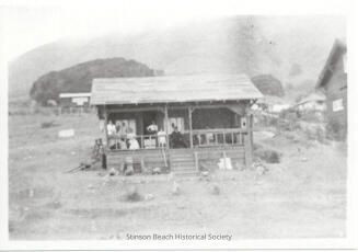 A summer cottage on the edge of a level field with trees and hills in the rear distance. Rock and debris litter the landscape in the front and sides of trhe house. On the left, in the distance, there is a barn-like structure and the distant right rear and the side are three more structures, appearing to be houses. Eight or more people, including a child, sit and stand on the front porch of the frame house.Collection