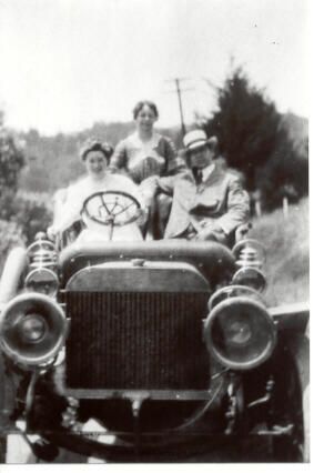 This is a frontal view of a very early open top automobile with three people sitting in it. There is a lady seated behind the steering wheel, which is on the right side of the car. She is wearing a white dress and no hat. There is a man wearing a hat seated beside her and another lady seated in back, also without a hat.Collection