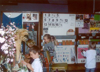 Color photo print from a slide of Montessori Preschool children . L to R, Gilbert, Oliver;Hyde, Jesse; Meyers, Chelsey; Fox, Linnea; Murphy, MariaCollection
