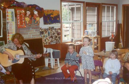 A color print from a slide of Montessori School. The teacher, Susan Tacherra, on guitar to left and children: Meyer, Chelsey; Fox, Linnea; and Murphy, Mairin taken in 2001.Collection