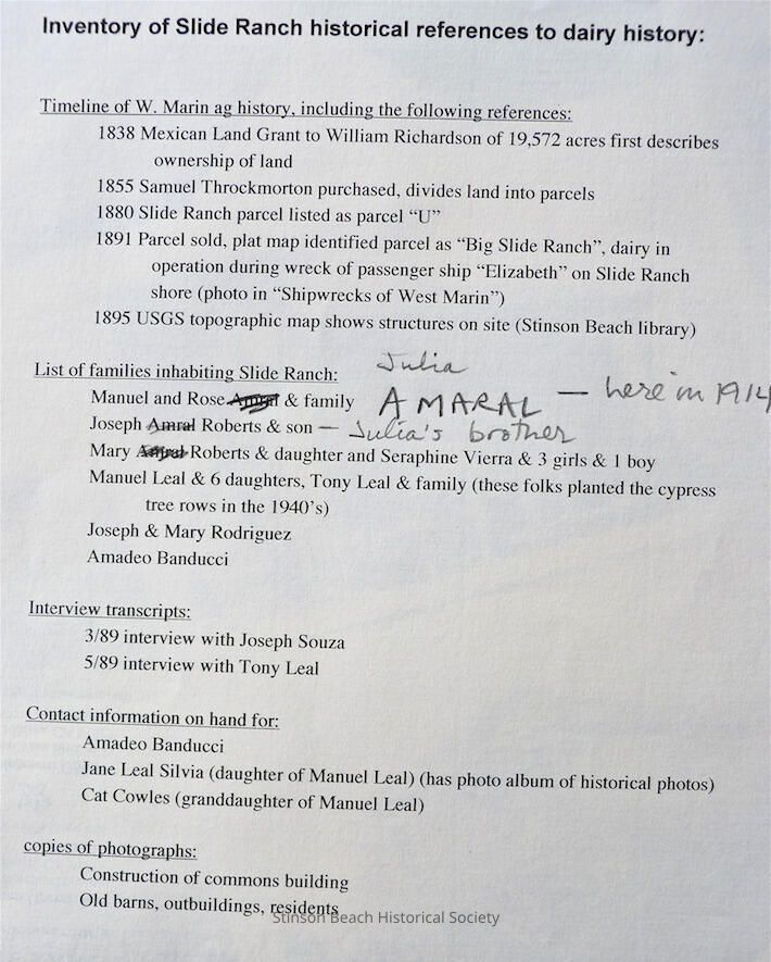 Thais a one-page document list of historical references Michael Moyle has written to inform some of the history of the Slide Ranch he has uncovered.Collection