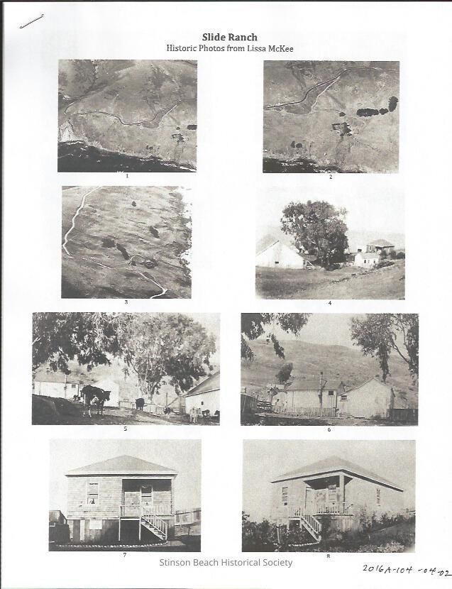 This is 17 black and white photographs sent to Tamae Agnoli from Michael Moyle in conjunction with the study of history of Slide Ranch. They are from the collection of Lissa Mckee. Photographs 1 , 2, and 3 shows aerial view of the ranch showing the road to the farm buildings. Photo 4 and 5 shows the large dairy barn, main house and smaller accessory buildings. Photo 6 shows 2 accessory buildings attached together. 7, 8, 9, 10 and 11 shows different views of the main ranch house. The 10 has 2 ladies in long skirts standing of its front porch. the 12 to 14 shows the large barn activities. 12 has a man with 5 large cows and 2 dogs and 17 chickens in foreground. 13 shows the same scenery but with 7 cows and the man sitting on a stool with his dog aside. 14 shows 2 men with large load of hey on hose drawn cart. One man is standing on top of the hey and other in front of the cart. There is the third man on the open loft hole about ready to lift the hey into the loft. #15 shows a bunch of hey about to be thrown into the loft from the opening with the lest of hey and hose still standing below. #16 shows the 3 men on the horse cart. One man is in front tethering the two hoses 2 other sitting in the back board planks.The farm buildings are in far back of the hill.#17 shows the same cart without hey hitch. it is operated by a young lady and 2 horses stands patiently. There is a building with a porch that is different from the large main house stands on the hill some distance away.Collection