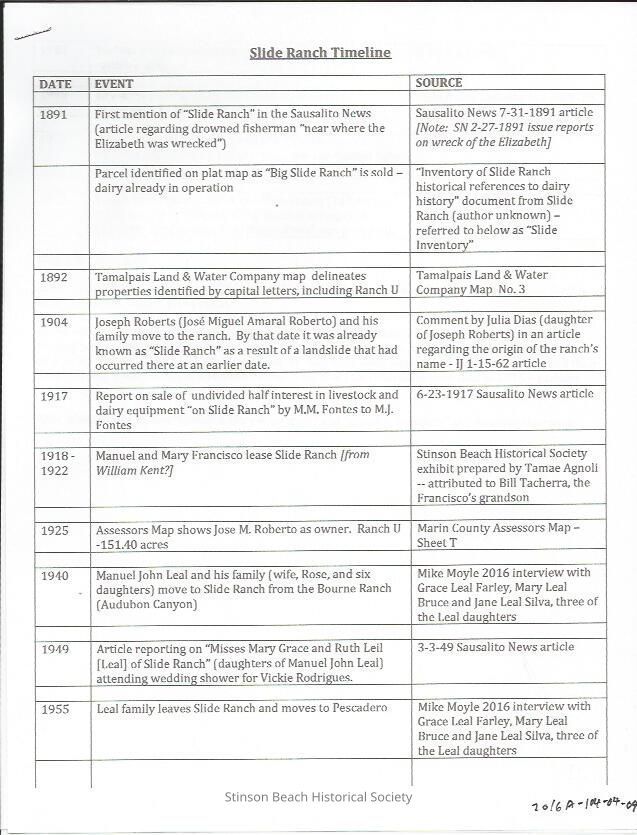 This is a timeline history of the Slide Ranch compiled by Moyle, Michael who is collecting the history of Portuguese ranchers and farmers who operated out of Slide Ranch. The item was sent to Tamae Agnoli in conjunction to the history of area farms and ranches.Collection