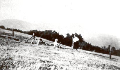 A black and white photographic print depicts two women on a hillside. The woman on the left is sitting on the ground in profile. The woman on the right is standing in front of a fence post facing the camera and holding a staff in her right hand. There are trees in the near background and hazy hills farther back. There is a stile visible behind the sitting woman.Collection