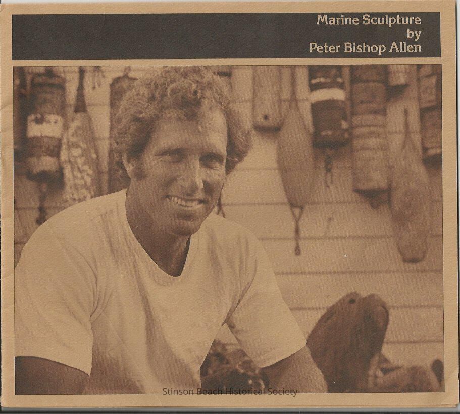 This is a sepia color printed brochure. A large 16H x 27W brown paper was printed and folded in 6 making it the final size of 8 x9 inches. The front cover shows a young man (Peter Bishop Allen) in a white t-shirt relaxed and smiling. On his back is a clap board wall with 12 various buoys hanging. There is a head of a wooden sculpted seal on his side. The back cover shows photographs of two of his sculptures, Bottlenose Dolphins and Harbor Seal, with explanations of each mammals habits. If one opens up the whole sheet, the rest of 4 segments has photographs of sculptures titled ; "Humpback Whale and Calf", "Sperm Whale and Walrus", "Grey Whale", and "California Sea Lions". The center folder has his name with his biography and signature with photographs of 8 of his sculptures.Collection