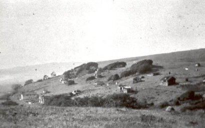 Early photograph of what is now Stinson Beach Old Town. The original Airey Hotel is in the lower left but most of any other structures on Highway One are hidden by trees on the hillside from which the photo was taken. Seventeen other structures are scattered on the rising hillside on the road from Aireys and a number of clumps of naturally occurring trees. A distant ridge and a faint suggestion of the bay is to the middle left of the picture.Collection