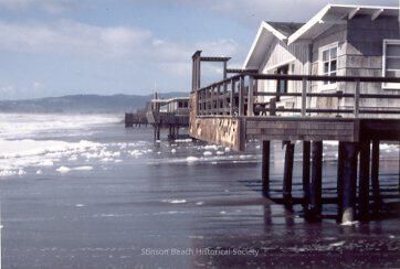 A color photograph of a gray shingled house with a deck, on the right.behind it to the left can be seen the deck of another, darker house and behind that the roof line and windows of yet another house. Beyond that is a dark structure that appears to be a retaining wall. There is white wave froth coming from the ocean on the left of the picture and the sand underneath the houses is wet.Collection