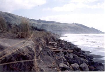A color photograph showing beach at high tide during the storm of 1983. Picture looks like it was taken from Seadrift Beach looking towards the park beach. The shore has been eaten away by the waves, creating a small clift. There are boulders, logs, dune grass and sandbags uncovered by the high tide. Highway 1 and cloudy skies are in the background. The ocean is foamy and stirred up.Collection