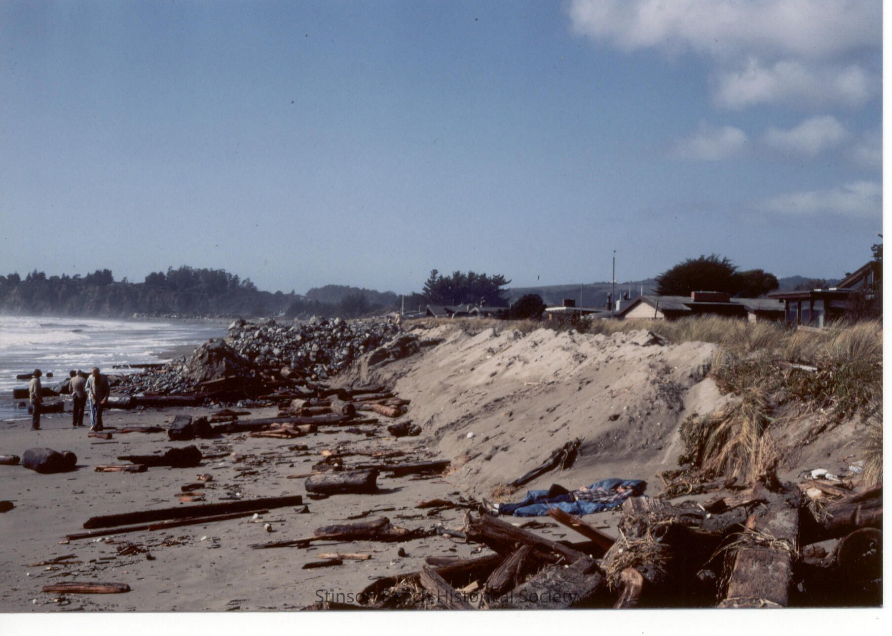 The ocean beach is strewn with logs and other debris. Three people are standing at the water's edge at the left of the picture.To the right , houses are visible set back above the sand bank with trees behind them abd a distant view of the mountain.Collection