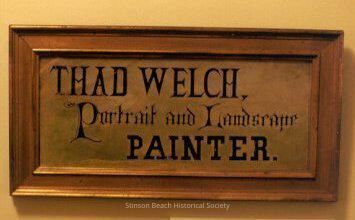 A color photograph of a sign in a frame reading 'Thad Welch Portrait and Landscape Painter'.