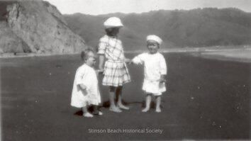 This black and white original photographic print shows three children standing on the beach at Bolinas. The oldest child, a girl, is wearing a plaid dress and a white hat. She is standing in the middle holding the hands of two boys (her brothers?) on each side. The boy on the left is a toddler and is wearing a dress. The boy on the right is older. He is wearing a smock dress with short pants visible underneath and a sailor cap. The ridge above the lagoon is visible in the background as is the ocean and the water entrance to the lagoon.Collection