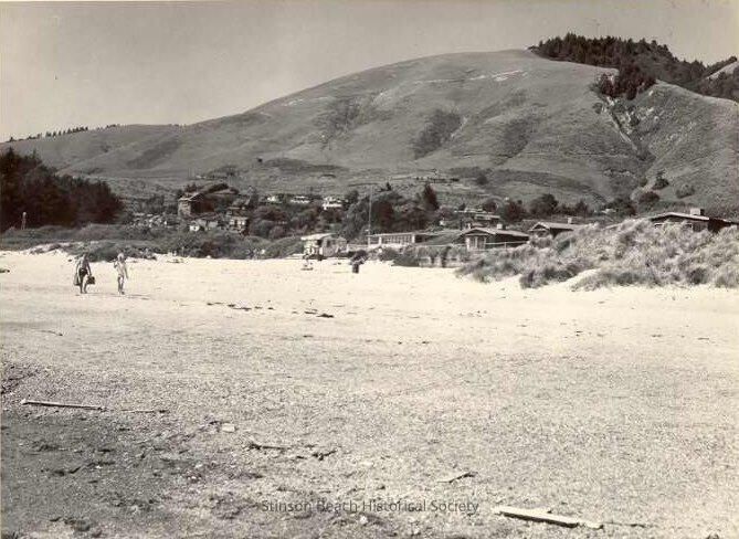 This original black and white photgraph shows an expanse of beach with buildings in the dunes and more buildings in the near background foothills, nestled at the base of a bare hillside.Collection
