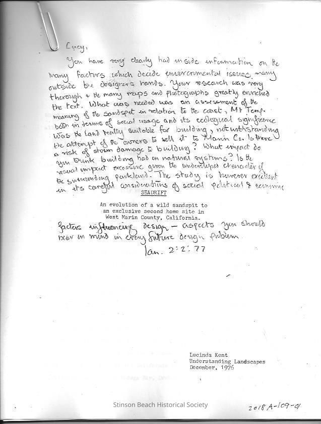 This 43-page volume of paper was originally submitted to a Landscape Class the author was taking at University of Oregon in December of 1979. On the title page of the paper is typed: "Seadrift: An evolution of a wild sandspit to an exclusive second home site in West Marin County, California. Lucinda Kent, Understanding Landscape, December 1976". On top of this typed title there is a handwritten note and comment from the professor dated Jan 2, 1977. The contents trace the history of the area and the history of the Seadrift Development that includes her great grandfather's purchase of the sandspit, creation of the gated community by her grandfather and involvement of her father who inherited the project, and her experience growing up in it. This thesis has became the basis of the timeline prepared by the Seadrift Association later in 1980s to obtain the final settlement agreement from the County and the California Coastal Commission to keep the seawall erected during the 1983 storm.Collection