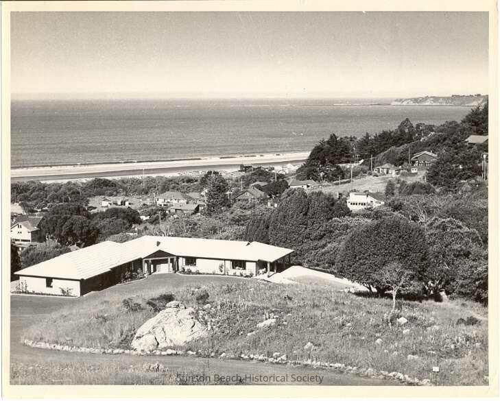 This is a panoramic view taken from Panoramic Hwy. and looking toward the ocean and the town of Stinson Beach. In the foreground is the Herbert house, a large L-shaped ranch style home. In the background can be seen The Sea Beach Hotel, the Airey Hotel, and the gas station down in the town. Behind it all is the sand beach and the ocean.Collection