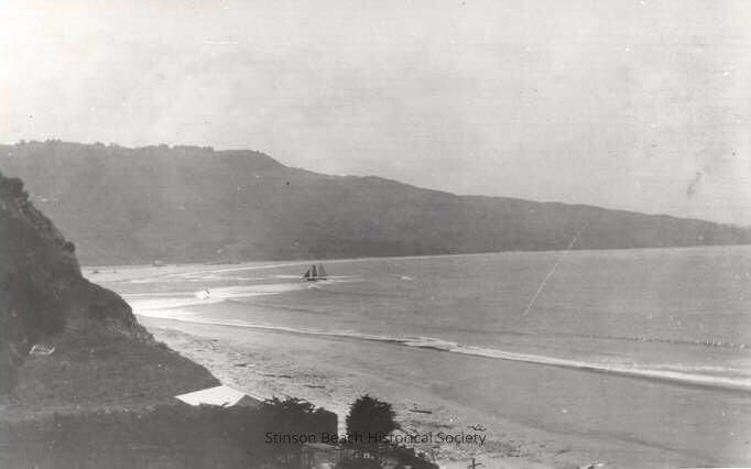 This original black and white photograph shows Bolinas Bay from Bolinas Beach looking southeastward towards Stinson Beach. Slightly left of center is a schooner heading in towards the entrance to Bolinas lagoon.Collection