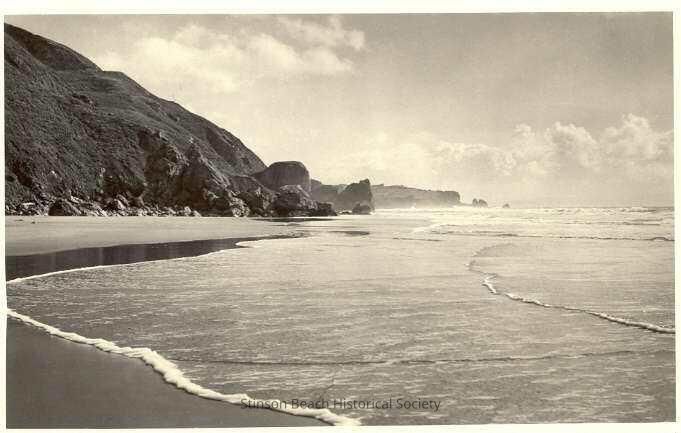 This original black and white photograph is taken from Stinson Beach on Bolinas Bay, looking southward towards the headlands at steep Ravine, with the coastal hills south of San Francisco dimly visible on the horizon at the right of the picture. The rocks at the south end of the beach stand out sharply in the low tide. In the foreground is a white wave edge with a wide expanse of sand between the wave and the hills behind the beach.Collection