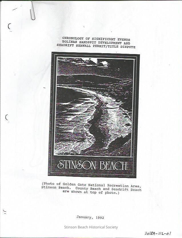This document was originally prepared for the defense of title dispute brought to Seadrift Owners' Association by a citizen's group and various governmental agencies including Marin County Planning Department and the California Coastal Commission against the building of the rock wall along the entire length of the Seadrift Beach property during and just after the storms of 1982-3 on an emergency basis, and the wishes of the homeowners to make the wall permanent. The photos and charts belonging to this document are missing. It contains the history of the sandspit from the 1820s to 1992.Collection