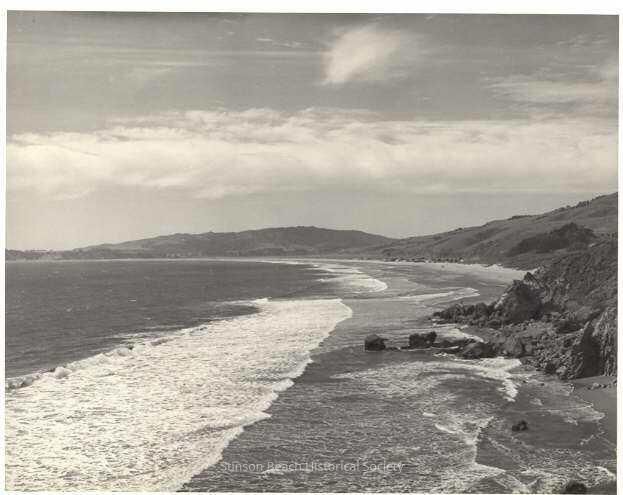This original black and white photograph shows a sweep of shoreline with rocks in the right foreground and middleground and beach and hills behind it in the background. There is a broad stretch of white water in the foreground and low clouds on the horizon. This picture of Bolinas Bay is taken from above and south of the beach.Collection