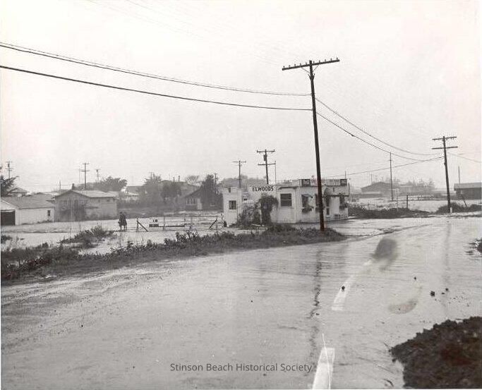 In the foreground is Highway 1 which is flooded and the flood extends off to the left up to several houses in the background. In the right background is Elwood's Restaurant which is at the corner of Calle Del Arroyo which is also flooded and houses can also be seen there surrounded by water.Collection