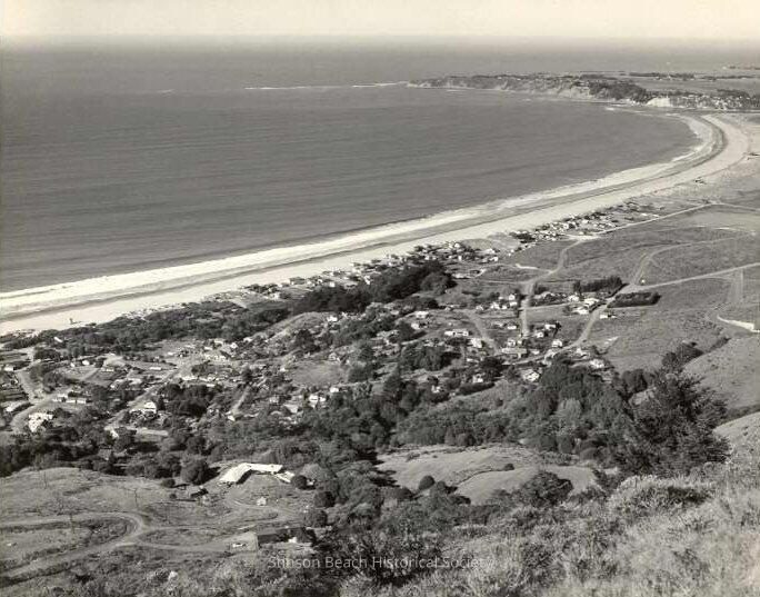 This original black and white photographic print shows the sweep of Bolinas Bay from the south portion of Stinson Beach town all the way around to the tip of Bolinas Point. At the center top of the photo is the white water showing the position of Duxbury Reef and at the far right can be seen the Bolinas Mesa. In the center foreground is the town of Stinson Beach with the calles and patios and a few houses on the sand spit along the beach. Back toward the hills (and the camera which is high on a hill overlooking the town) is the rest of Stinson Beach including Old Town and the Highlands.Collection