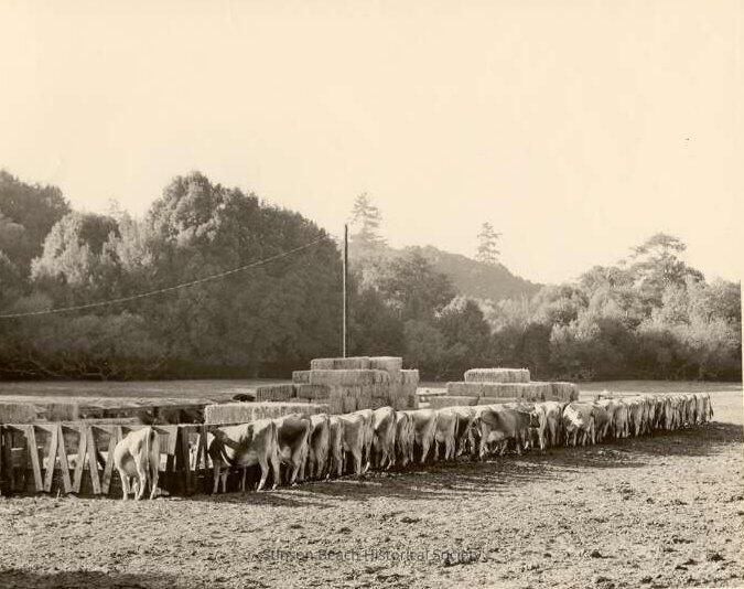 This is a rear view of a row of about 30 cows with their heads in the stanchions to get their food. Bales of hay are piled up in stacks farther away, and in the far background are trees and in the distance the mountain.Collection
