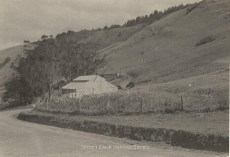 This is a picture of the White Gate Ranch taken from the road, which runs across the bottom of the picture, with the driveway leading to the buildings at the lower left. First there is a large white barn and then several darker colored buildings in the background. There are trees around the buildings to the left of the barn. The grassy slope of the mountain rises behind all the buildings.Collection