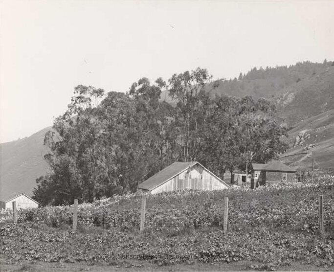 Ranch buildings on a hillside, backed by eucalyptus and other trees and showing fencing in the foreground. There are four buildings visible, two appear to be barns while the others could be dwellings. Rocks and trees are on the hills behind, and wild growth, possibly blackberries, fill the foreground on both sides of the fence.Collection