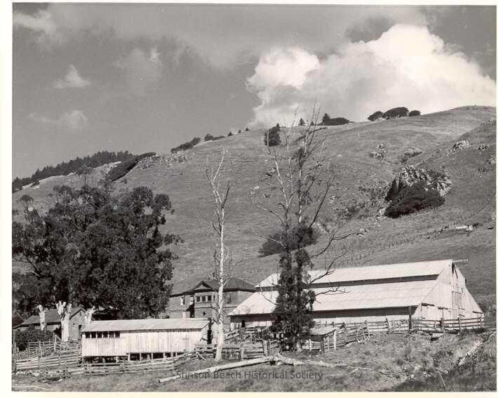 A closeup view of two ranch structures, one a frame barn and one appearing perhaps to be a frame bunkhouse. Slightly up the hill in the middle of the photograph is a large stone residence and a smaller stone structure to its left. Several large trees shelter these buildings. The hillside rises immediately behind the buildings with a large rock outcropping and some native trees against the sky. Large white clouds show at the crest of the hill. Fenceposts can be seen going up the hill to the left of the buildings. In the foreground there is extensive wood fencing and some felled trees.Collection
