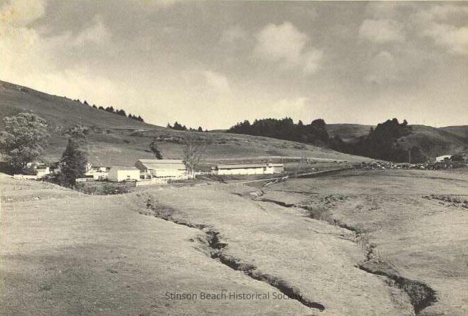This original black and white photographic print is taken from the ocean side of Panoramaic hightway looking across to the ranch. The foreground is grassland with two eroded gullies running toward the camera. Behind the line of Panoramic Highway are the ranch buildings. There is a long, low barn on the right and a taller barn to the left of it. To the left of the barns are smaller buildings, some among the trees. All the buildings are painted white. The hillside rises behind the buildings.Collection