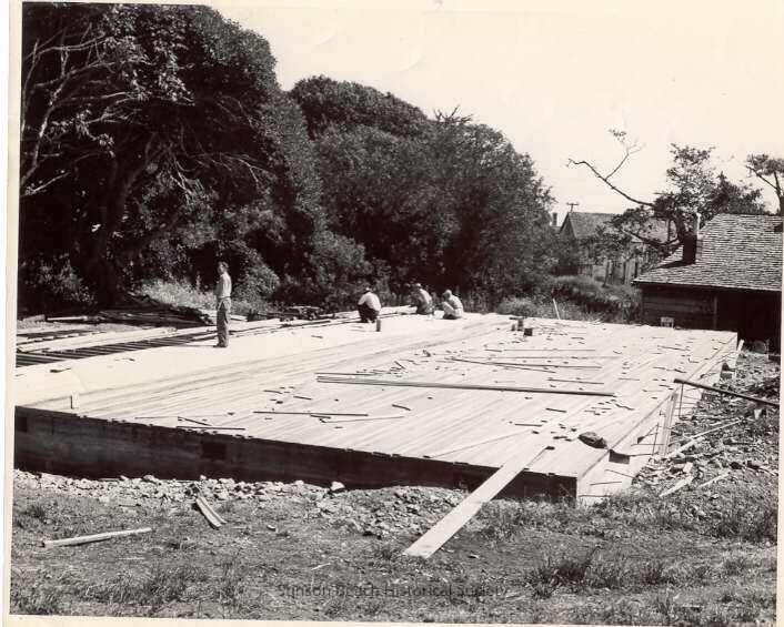 Photograph showing four men working on a building in progress. The foundation with rebar is in and a wooden flooring is being laid on top. The edge of the firehouse and many trees show in the right rear of the photograph and along the top of the picture. Lester Sadler is standing on the left of the floor with Joe Bordanaro crouched to his right. Two crouched men to Bordanaros right are unidentified. A third structure shows at the right rear.Collection