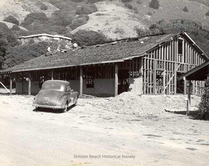 This picture is taken from in front of the Community Center Hall, located at Belvedere St. and Highway 1 in Stinson Beach. The framework is up and much of the roofing is on. At upper left on the roof are bundles of shingles waiting to be used. An automobile is parked in front of the building.Collection
