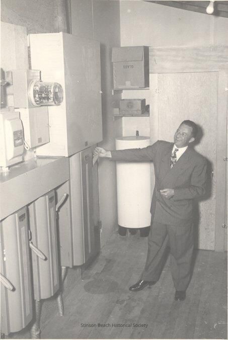 This original black and white photograph depicts a man (Lester Sadler) pulling a switch. At the left of the photo are some electrical meters and behind the man's arm is a hot water heater. See notes.Collection