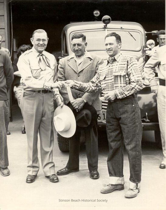 This is a close up picture at the entrance of the Stinson Beach Fire House on Hwy. 1 at Belvedere in Stinson Beach. At the front of the picture are 3 men standing in front of the fire truck which is partly in the garage and facing out. The three men are Elting Hubbard, Manuel Fostine, and Lester Sadler. There are unidentified people behind them on both sides of the truck.Collection