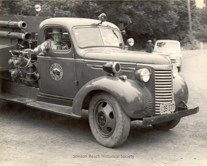 This original black and white photograph shows the cab of a fire truck with a smiling man in glasses and a hat looking out from the passenger window. The door of the truck has a shield reading Marin County Fire Dept. The man is Elting Hubbard.Collection
